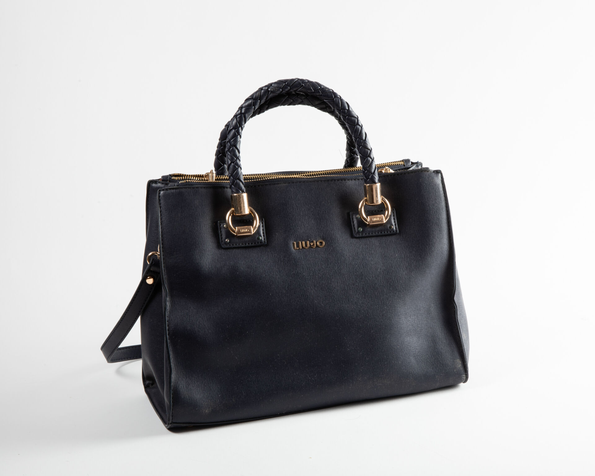 LIU JO Sac cabas en simili cuir bleu, à deux anses tressées et une bandoulière à trois compartiments, les deux compartiments latéraux zippées et le compartiment central aimenté, garniture intérieure de tissus rose logoté, à deux poches appliquées dont une zippée, accastillage en métal doré. Oxydations