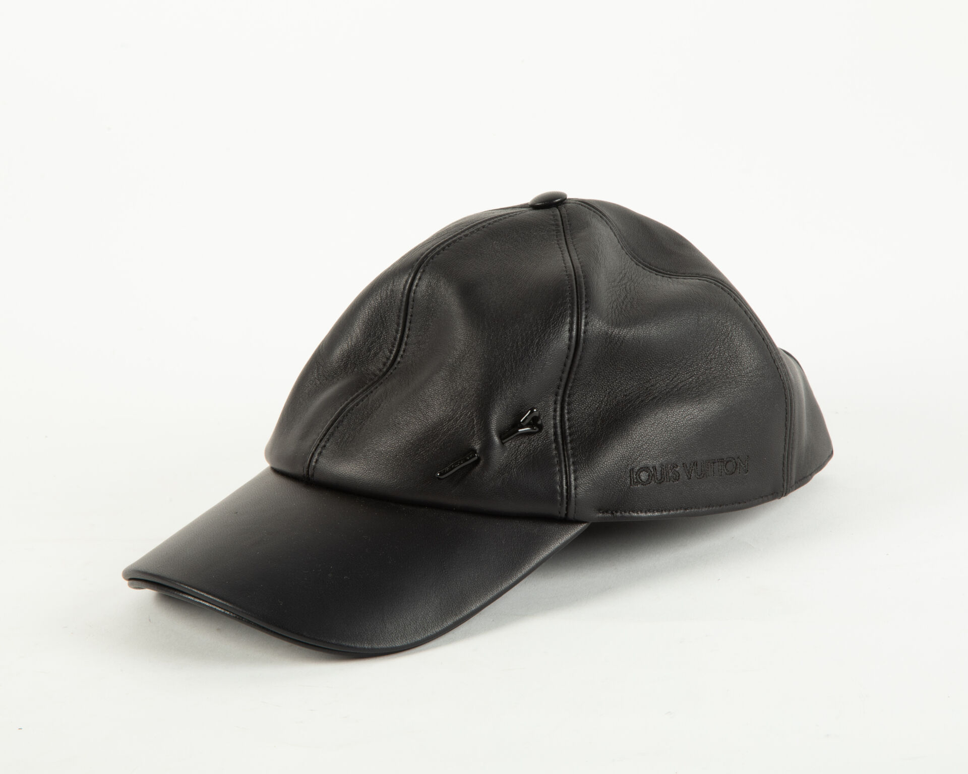 LOUIS VUITTON Casquette en cuir d'agneau noir à décor d'une épingle à chapeau laquée noir, lien de serrage en cuir noir. Tour de tête : 20 cm environ