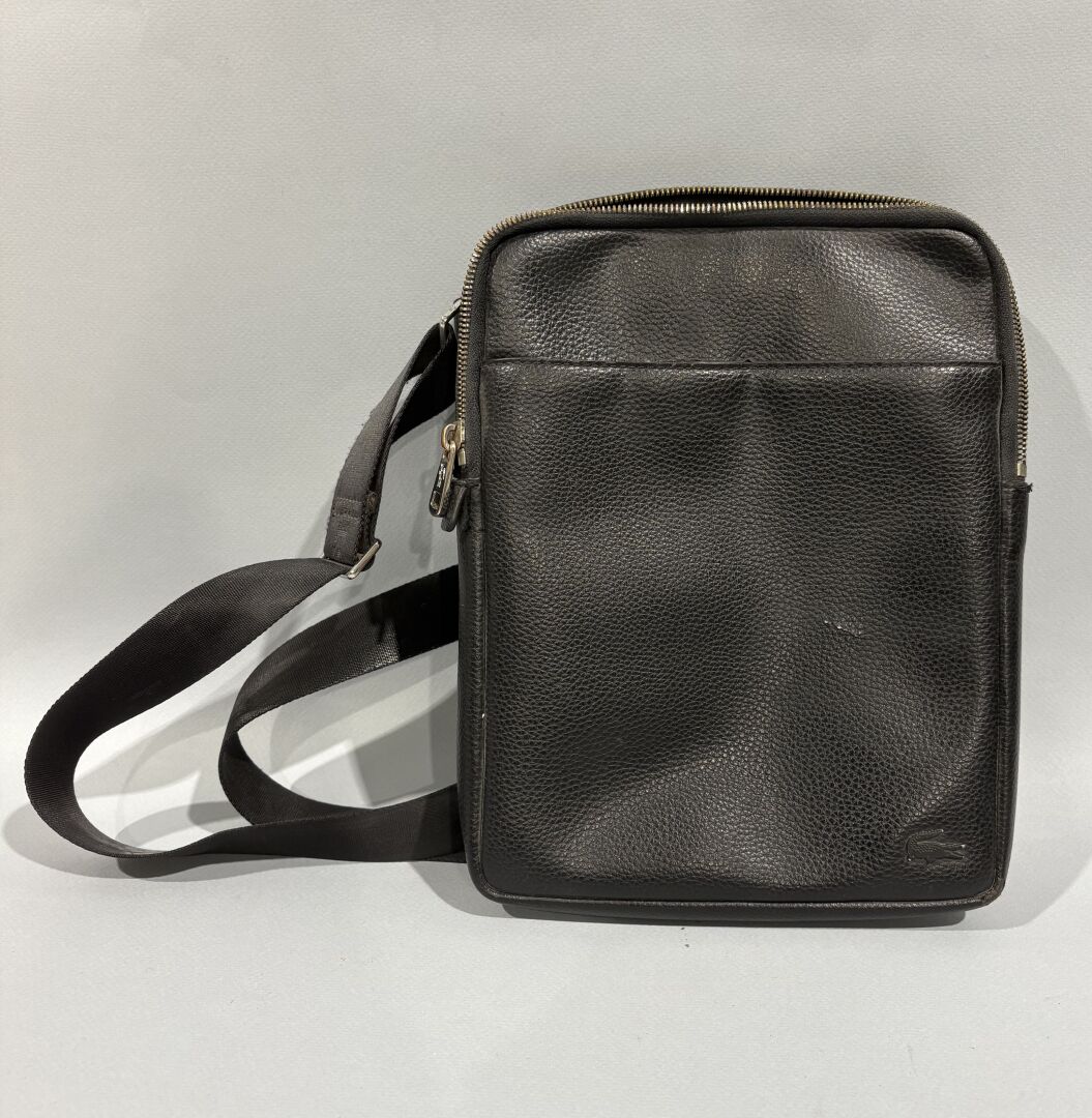 LACOSTE Sacoche à bandoulière pour homme en cuir noir à 2 compartiments dont un fermé par une fermeture éclair découvrant 2 compartiments intérieurs dont un zippé et un porte-carte intégré État d'usage, craquelures et déchirures au cuir, fermeture éclair non fonctionnelle