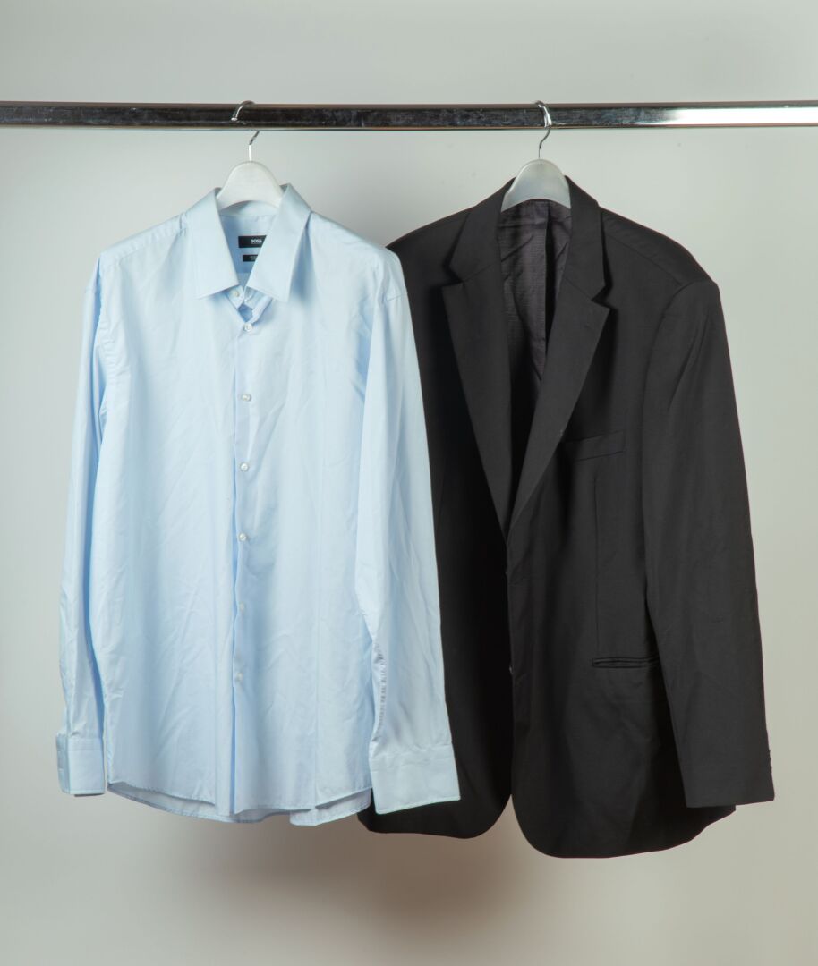 HUGO BOSS Ensemble pour homme comprenant une veste de costume en viscose et acétate noire (taille 50) et une chemise en coton bleu regular modèle Enzo (Taille 45)