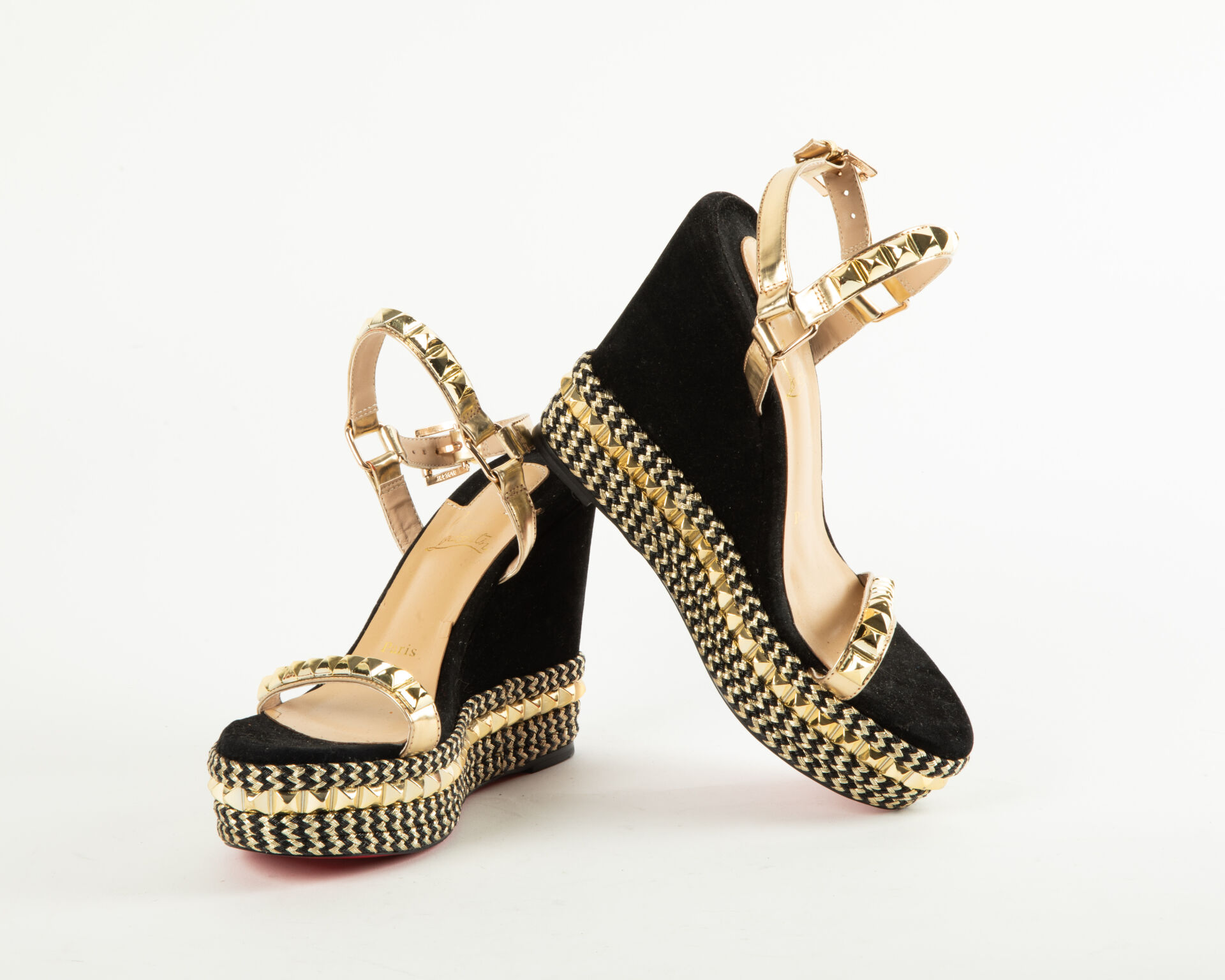 LOUBOUTIN Modèle Piraclou - Paire de sandales à talon compensé en daim noir, cuir doré et tresses de tissus noir et or à décor de frises de clous dorés Pointure 39