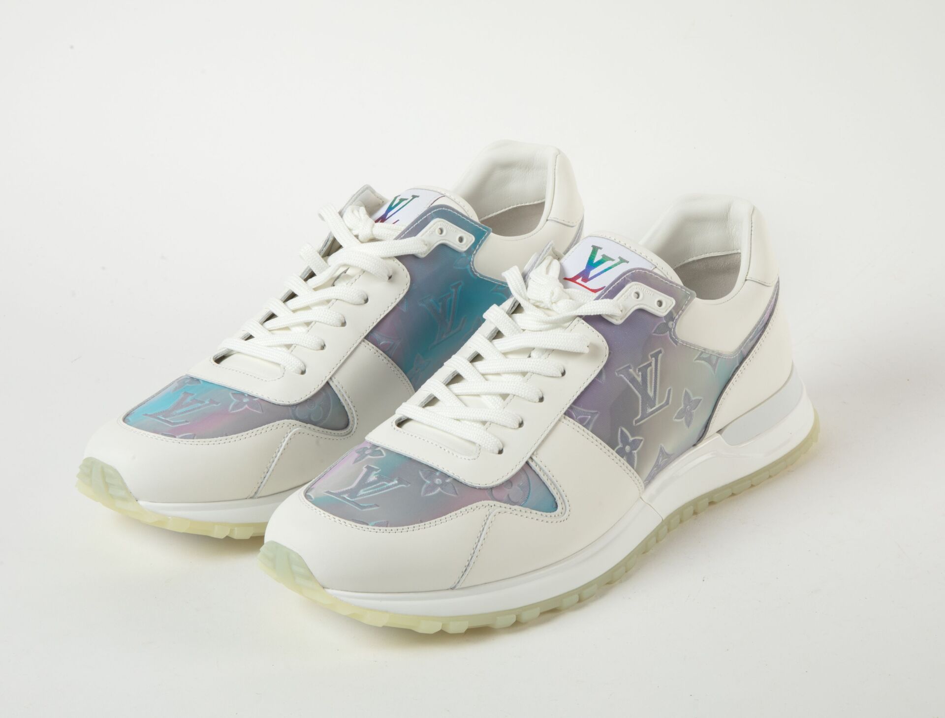 LOUIS VUITTON Modèle Run Away - Paire de baskets pour homme en cuir blanc et empiècements irisés rehaussés du motif Monogram Taille 8 Avec dustbags