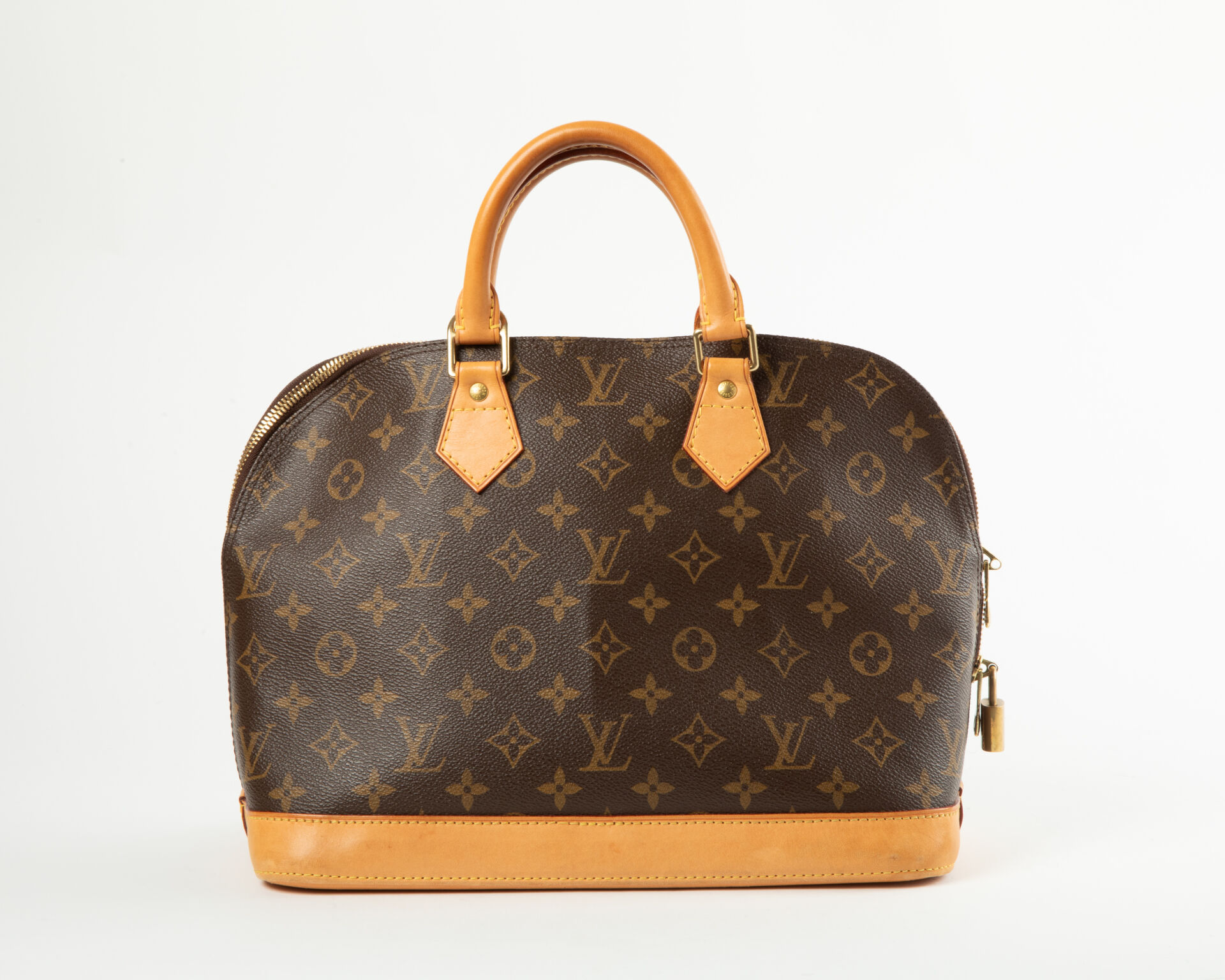 LOUIS VUITTON Modèle Alma - Sac à main en toile monogram et cuir naturel, double poignée, fermeture à glissière à double curseur, cadenas sans clef, doublure en toile marron. Tâche au cuir dans l'angle bas et sous la base, H : 25 (hors anse) -