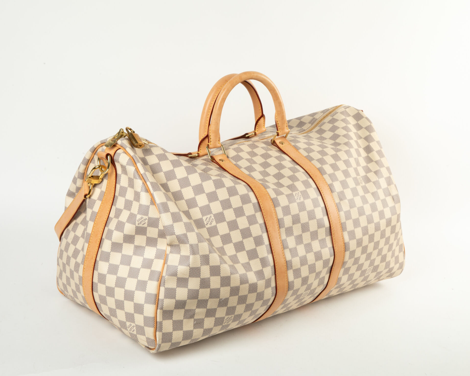 LOUIS VUITTON Modèle Keepall - Sac en toile monogram crème et cuir naturel à deux anses et bandoulière amovible, porte-adresse en cuir, accastillage en métal doré, cadenas, pas de clef, fermeture zippée, doublure en tissus beige H : 29 (hors anses) - L : 55 -
