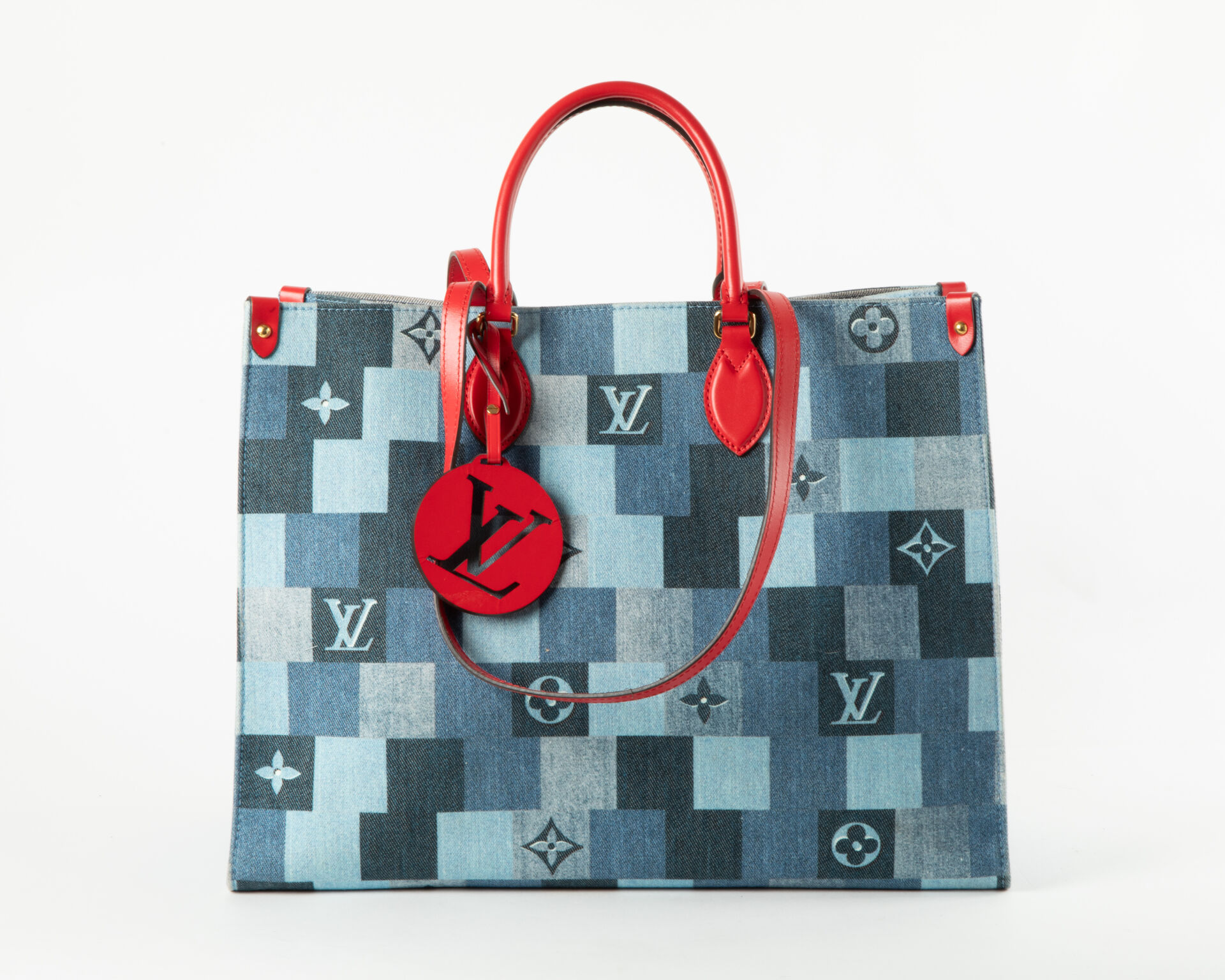 LOUIS VUITTON Modèle OnTheGo - Sac cabas en denim à décor géométrique, anses et empiècements en cuir rouge, accastillage en métal doré, intérieur en denim à une poche plaquée et une poche plaquée zippée. Tâches à la doublure H : 32 (hors anses) - L :