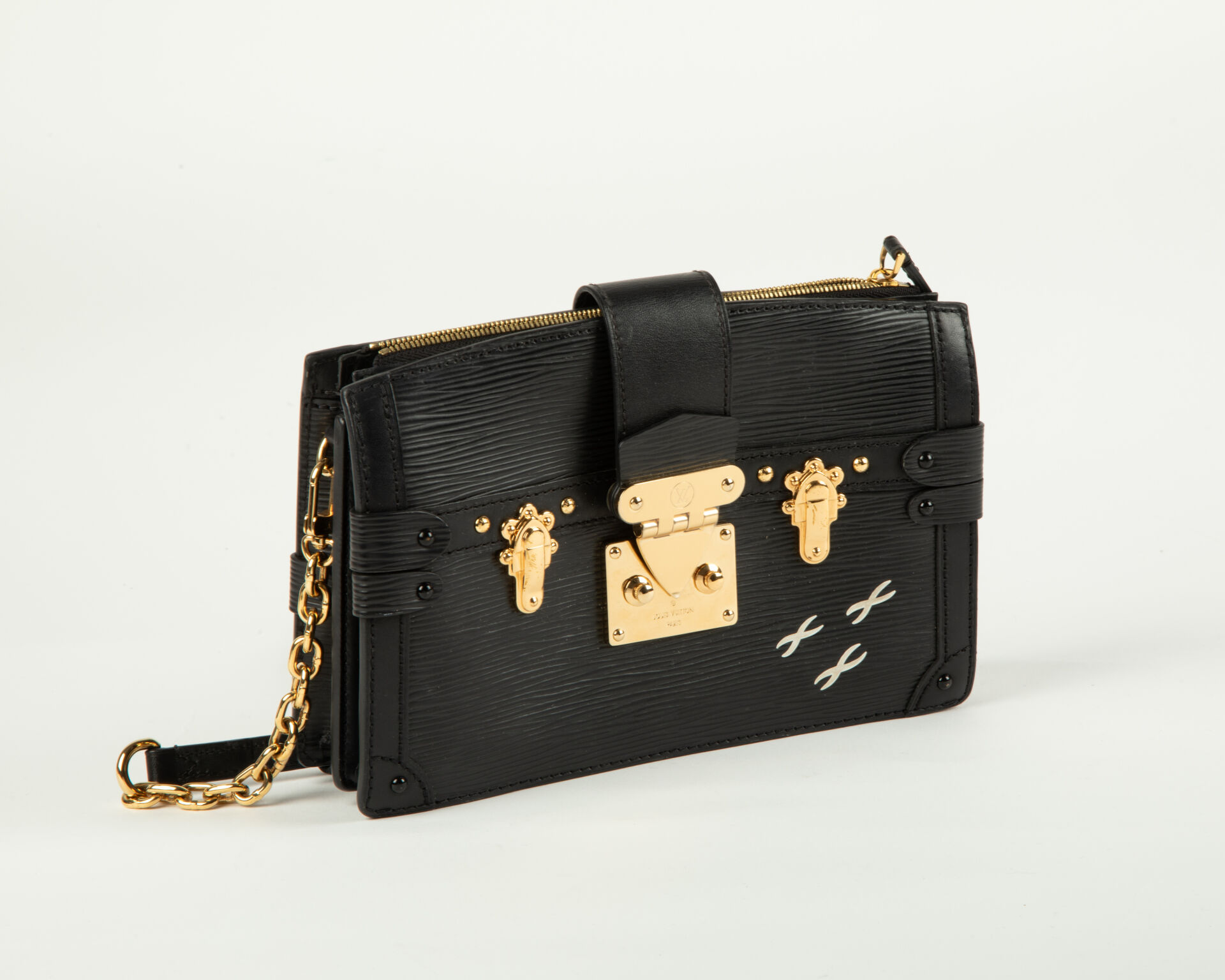 LOUIS VUITTON par Nicolas Ghesquière Modèle Trunk - Sac pochette en cuir épi noir, fermoir poussoir sur patte et attaches en métal doré, doublure en cuir beige, motif malletage à deux compartiments et une poche en cuir appliquée, anse bandoulière amovible en cuir et chaine