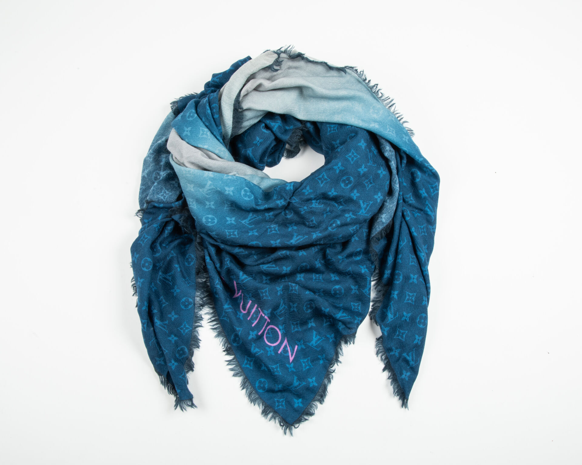 LOUIS VUITTON Châle en laine monogram bleu à décor dégradé gris, le nom de la marque inscrit en bas à droite en lettres bâton rose Taille : 135 x 135 Dans un coffret de la marque