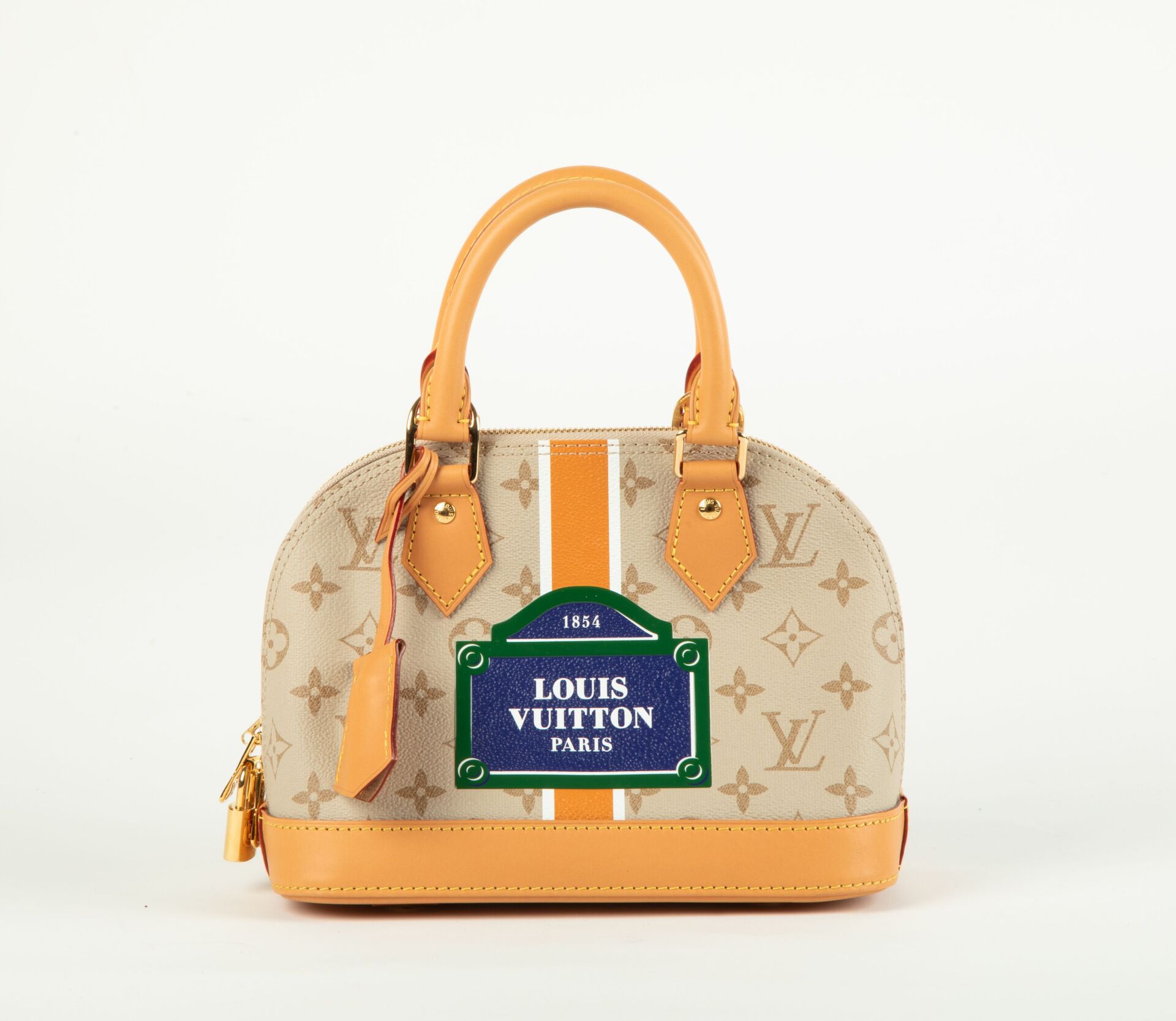 LOUIS VUITTON Collection Monopaname - Sac Alma BB en toile monogram beige et cuir naturel à décor en faux semblant d'une plaque de rue, sac porter épaule et bandoulière, accastillage en métal doré, cadenas, clef et clochette, intérieur en toile orange à une poche appliquée.