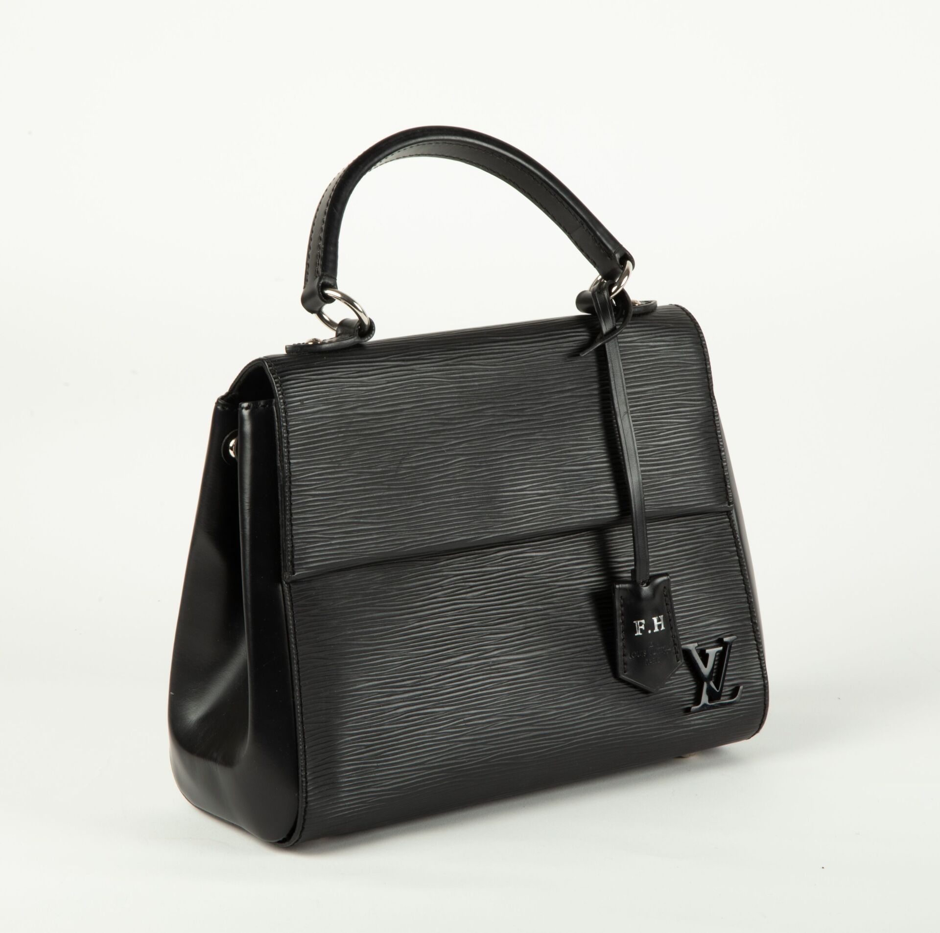 LOUIS VUITTON Modèle Cluny - Sac porter main en cuir épi noir, accastillage en métal palladié, fermoir aimanté sous rabat, poignée, anse bandoulière amovible en cuir lisse noir, porte clef sous clochette, clochette chiffrée "FH". Petites taches H : 20 (hors anse) - L :
