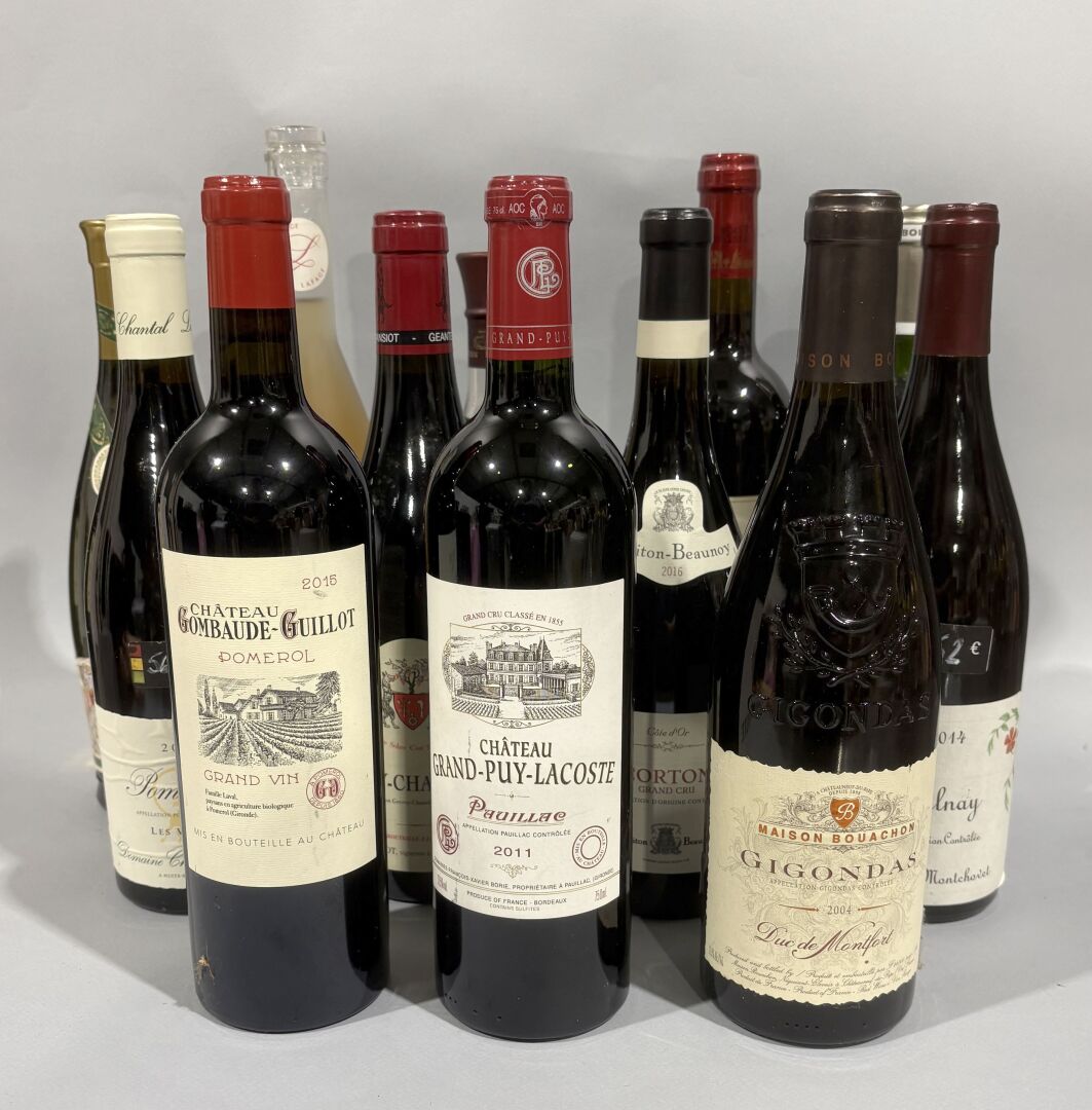 Suite de 12 bouteilles de vin comprenant : Château Lacroix Chantecaille Saint-Emilion grand cru 2015 Lafage Miraflores rosé 2018 Gevrey Chambertin geantet pansiot 2011 Une bouteille de vin moldave Nuiton-Beaunoy corton grand cru 2016 Volnay Didier Montchovet 2014 Château Gombaude-Guillot Pomerole 2015 Château Grandpuy-Lacoste Pauillac 2011 Maison Bouachon Gigondas duc de Montfort 2004 Tarani millésime