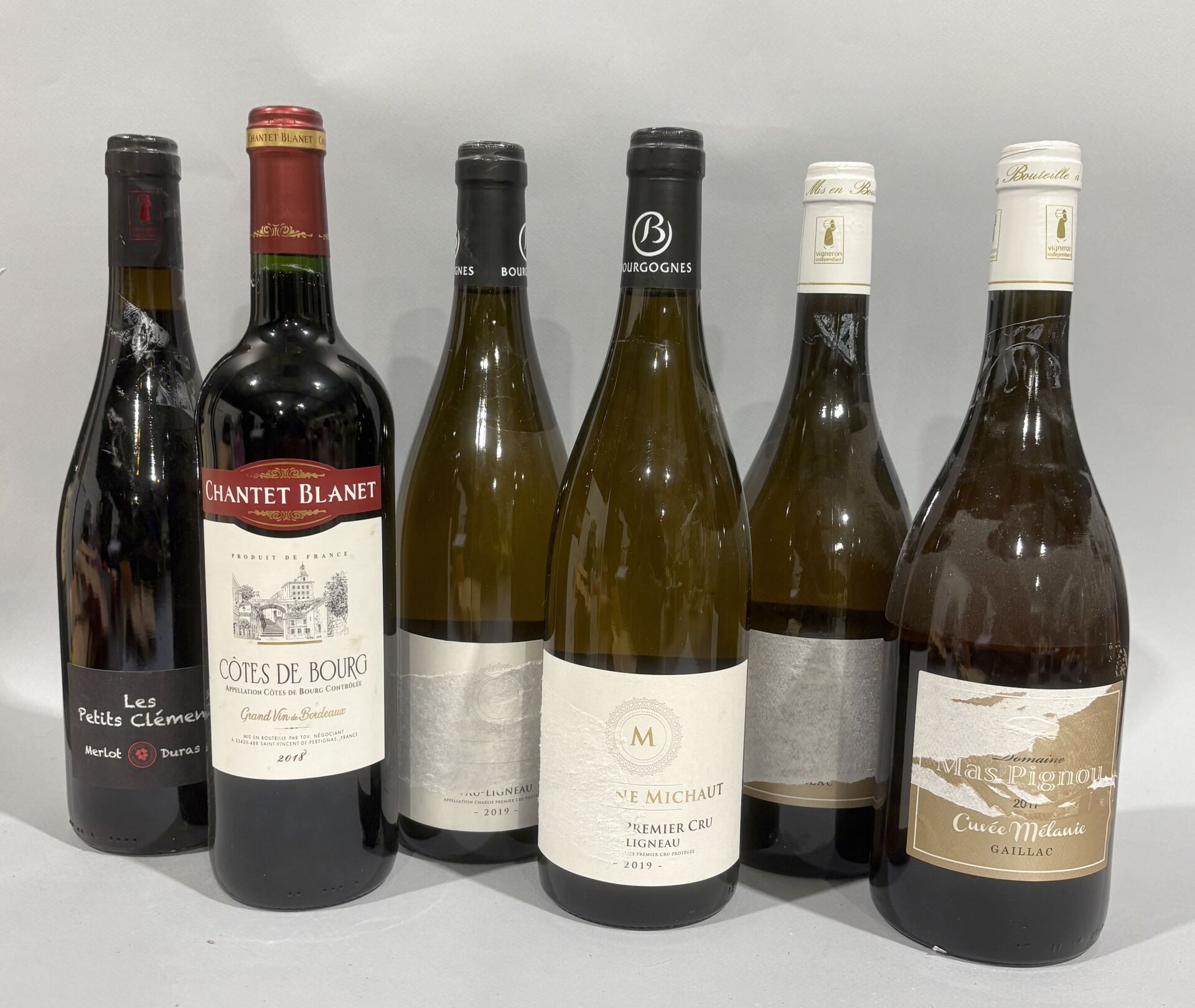 Ensemble de 4 bouteilles de vin blanc comprenant : - 2 Bouteilles de Mas Pignou Cuvée Mélanie, Gaillac (étiquettes arrachées) - 2 Bouteilles de Domaine Michaut premier cru (étiquettes arrachées) On y joint deux bouteilles de vin rouge : - Les petits cléments - Chatnet Blanet