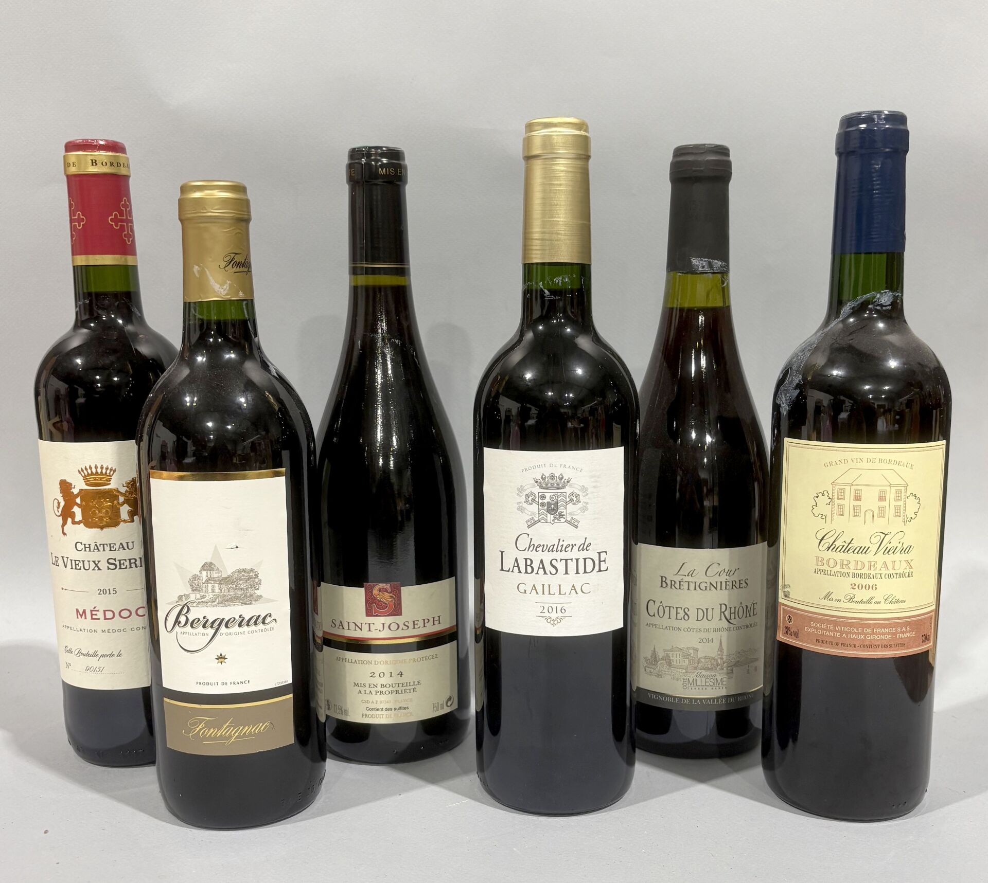 Ensemble de 6 bouteilles de vin rouge comprenant : - 1 Bouteille de Bergerac Fontagnac - 1 Bouteille de Saint Joseph 2014 - 1 Bouteille de Chevalier de Labastide, Gaillac, 2016 - 1 Bouteille La Cour Bretignieres, Cotes du Rhone - 1 Bouteille de Château Viera Bordeaux