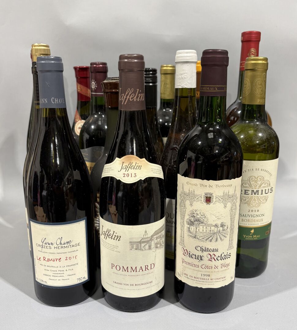 Suite de 18 bouteilles de vin comprenant : - 1 Bouteille de Sauvignon Premius 2010 Yvon Mau - 1 Bouteille de vin blanc petillant Ciao Secco Novellina - 1 Bouteille de Chateau Dieux Relais Premières côtes de Blaye 1998, rouge - 1 Bouteille de vin
