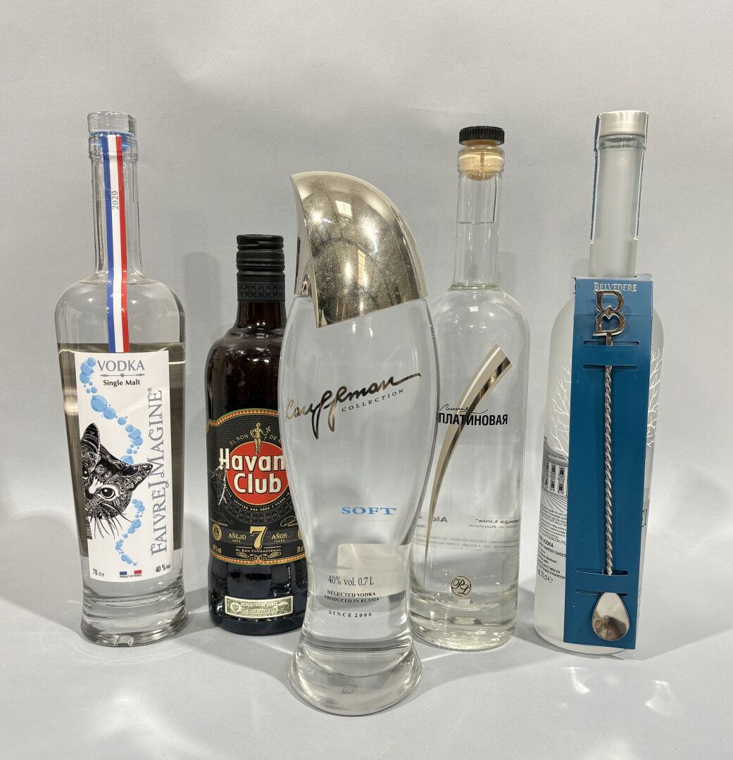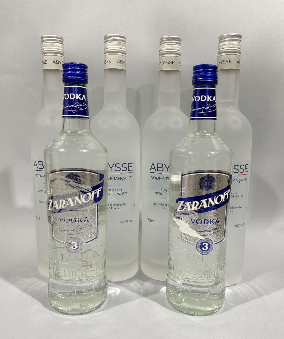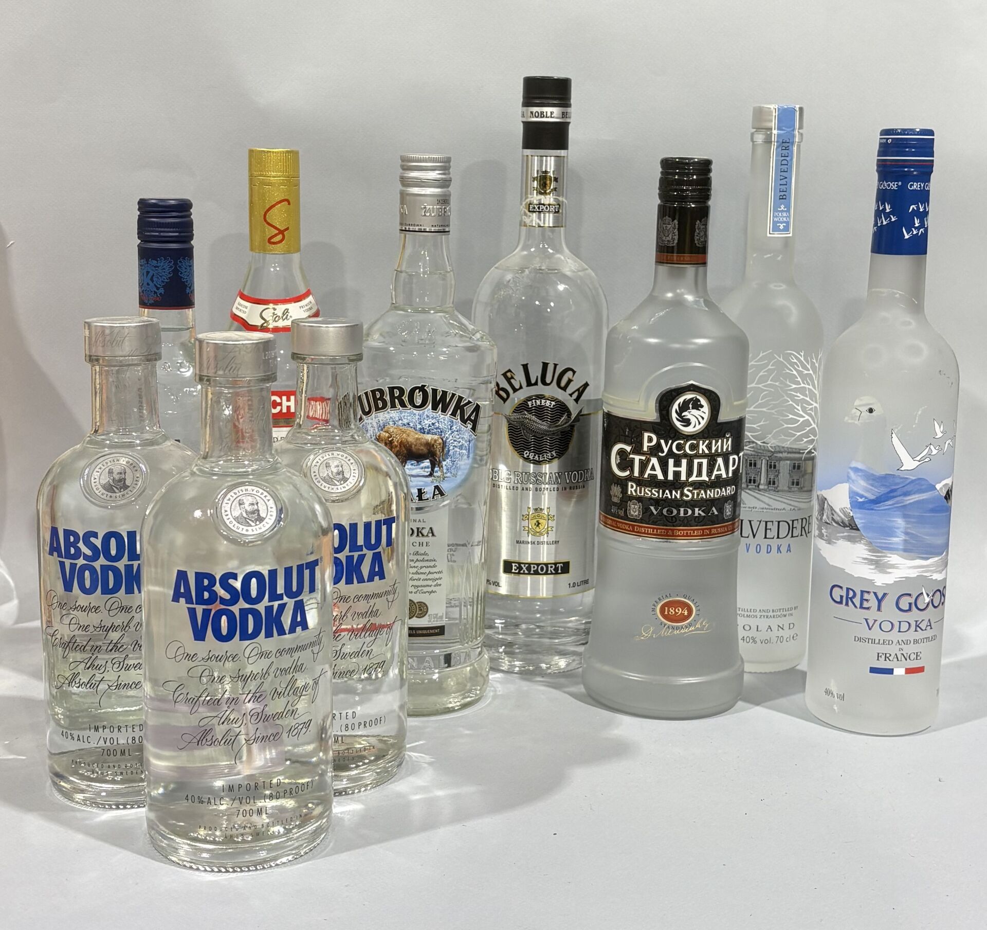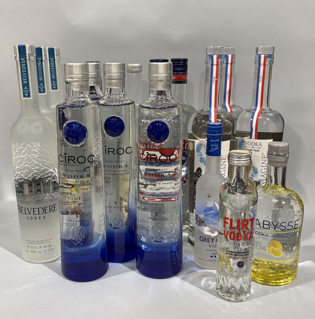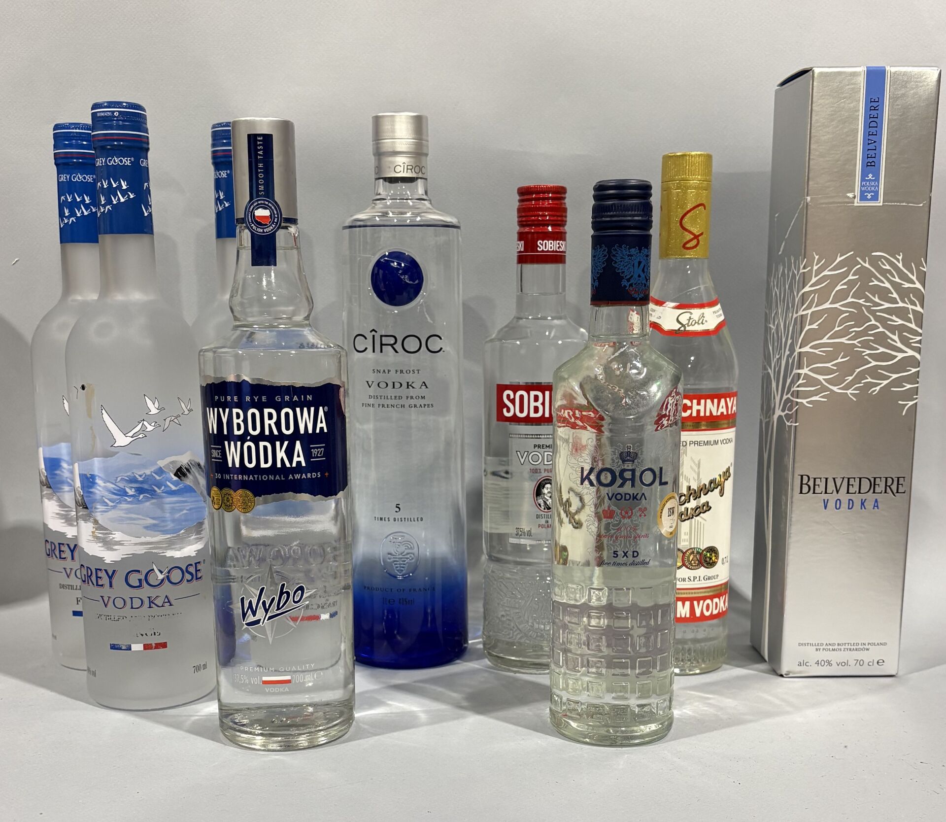Ensemble de 9 bouteilles de Vodka comprenant : - Ciroc vodka - 1L - Vodka Belvedere 70 cL emboitage - Grey Goose Vodka 70 cL - 3 bouteilles - Sobieski vodka 70 cL - Stolichnaya vodka - 70 cL - Wyborowa vodka - 70 cL - Korol vodka -